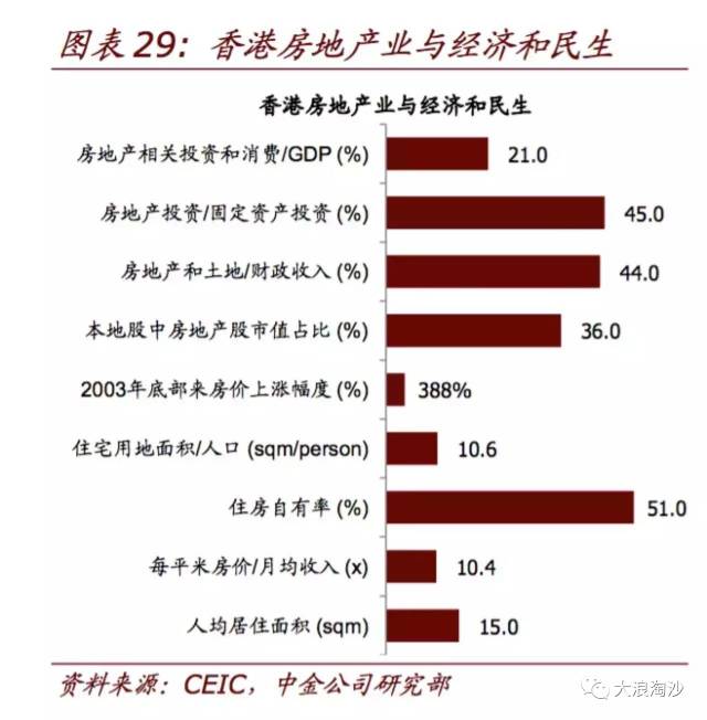 房地產行業已經牢牢地綁架了香港經濟與政治的方方面面:回歸前,香港房地產以及關聯行業增加值佔香港GDP的份額在40%以上,整個區域經濟活動幾乎圍繞著房地產業而轉。房地產投資占固定資產總投資60% 以上,同時政府的財政收入也主要依靠土地收入以及其他房地產相關稅收。債券市場中房地產股占港股總市值1/3,股票和房地產價格呈現「榮辱與共」的現象。房地產和銀行業也互相依賴,房地產開發商和居民住宅按揭始終占銀行貸款總額的 30%以上。香港四大家族——李嘉誠、郭得勝、李兆基、鄭裕彤四家,全部以地產發家。