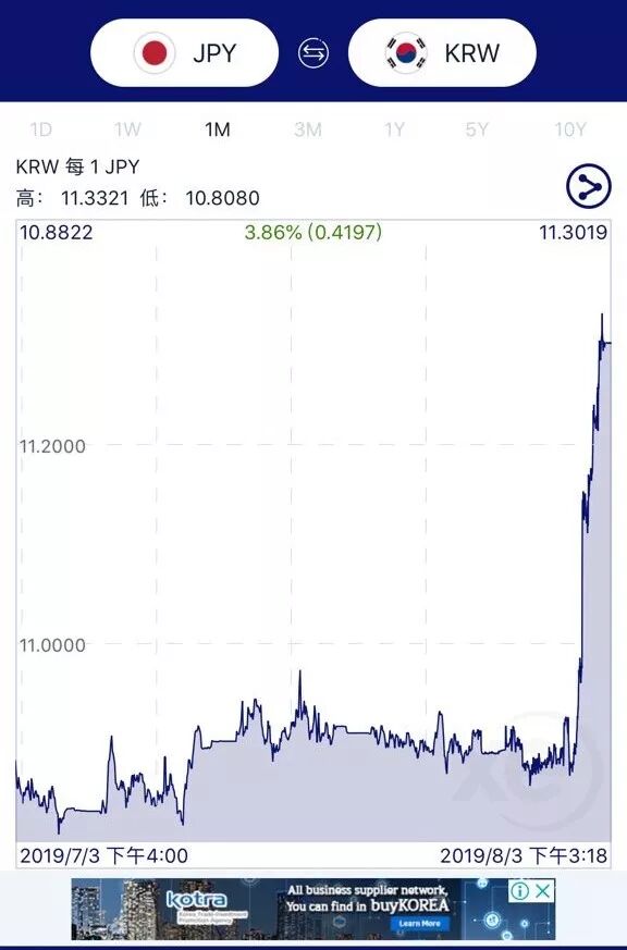 從日韓貿易戰爆發後,這張日元對韓元的匯率變化可以看出,韓國貨幣簡直是一敗塗地、毫無還手之力。國際金融市場單方向看好日本,一目了然。
