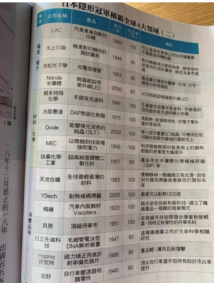 除了前面提到的大型公司外,日本還有著一個個不為外界所知的隱形冠軍,市場佔有率極高,稱霸各個領域。