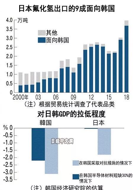韓國業界推測SK海力士剩下的高純度氟化氫與光阻劑庫存只剩下1.5個月。三星電子的情況也大致相近,雖然曾留學日本的三星副會長李在熔曾於7月中旬訪日,試圖緩和關係,但並未順利解決原料取得問題。