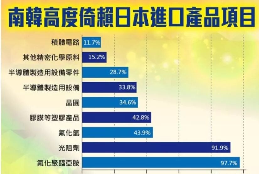 韓國經濟嚴重依賴以三星、海力士、LG為代表的半導體產業,這些韓國科技巨頭是全球重要的快閃記憶體、內存、面板生產商,自身加工能力極強,但在關鍵材料及裝備上要依賴日本公司,這是日本能夠刺痛韓國的關鍵。