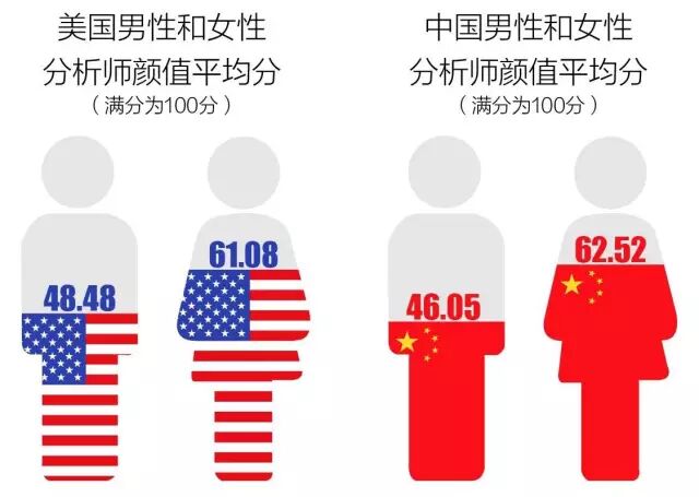 數據統計顯示,女性分析師的顏值得分普遍高於男性,而且這一現象在中美皆存在。美國男性和女性分析師顏值平均分分別為48.48和61.08(滿分為100分),中國男性和女性分析師顏值平均分則分別為46.05 和62.52(附圖)。