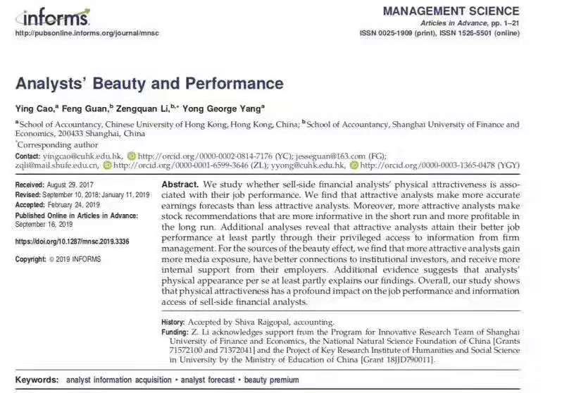 9月16日,由香港中文大學和上海財經大學多位教授聯合署名的論文《Analysts' Beauty and Performance》(分析師的美貌和業績)在《管理科學上》發表。